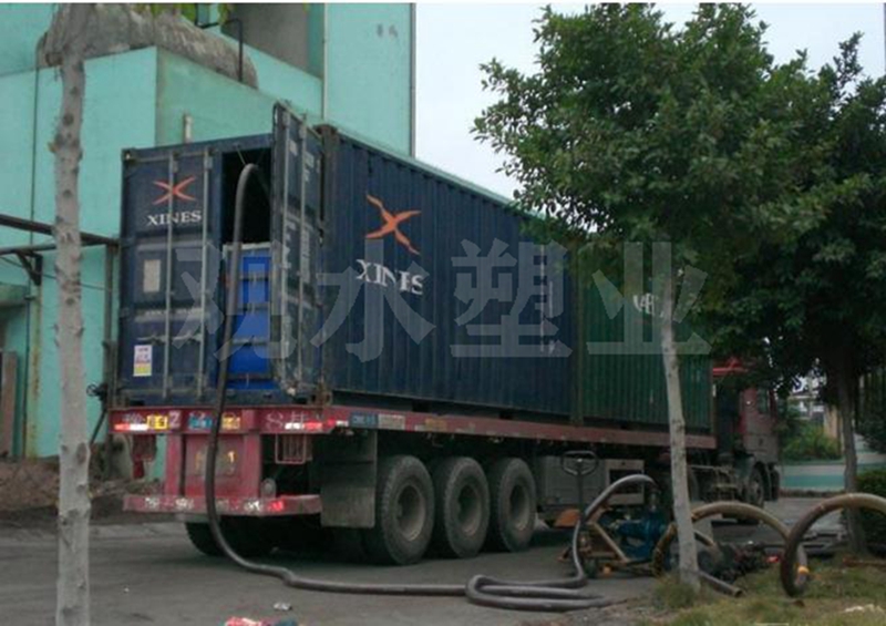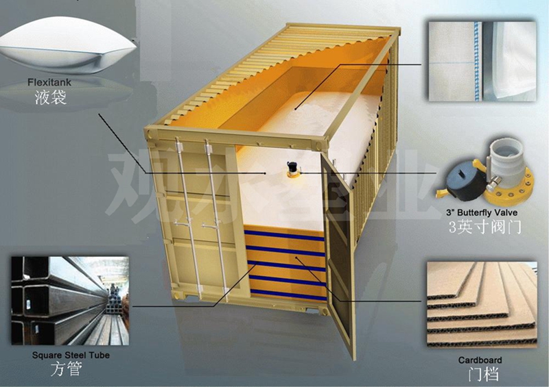 液袋适用于20英尺集装箱,安装液袋时要严格遵守集装箱选箱要求手册和液袋铺装指导手册,灌装操作时要严格按照标准化操作流程进行。安装完成后只需将阀门和进料口连接,就可以装料。装料过程结束后,满载货物的液袋和集装箱就可以通过铁路、公路、货轮进行中远途运输了。